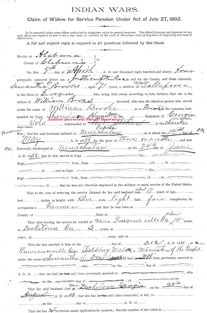 Samantha’s pension application for William’s service in the Indian Removal said he served in Hamilton’s Company. An auditor reviewing the pension application noted William Brooks instead served under Sheriff Brewster. One curious aspect of the record confirms a possible familial connection to Jabez Brooks’ lineage – Samantha included details for William’s service that instead belong to (James) Martin Brooks, one of Jabez’s sons.